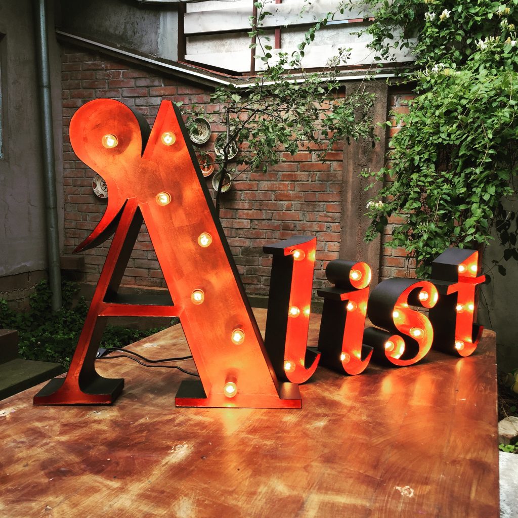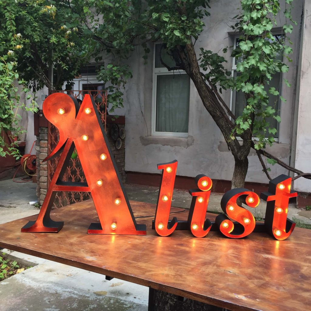 Logo volumetric din metal (otel) cu becuri, strat anticoroziv / finisaj vopsea exterior si aplicatie cupru la interior / strat de protectie.